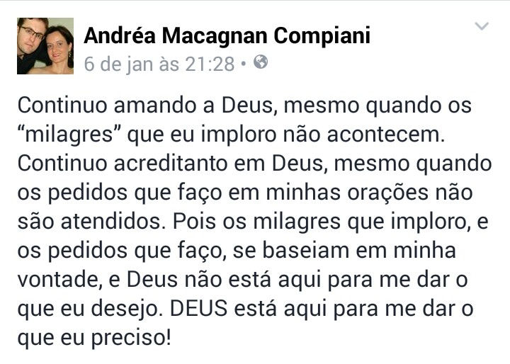 Nós do site Minha Água Doce reforçamos o pedido. Reze pelo milagre que ela mesmo postou em seu Facebook, dias atrás.