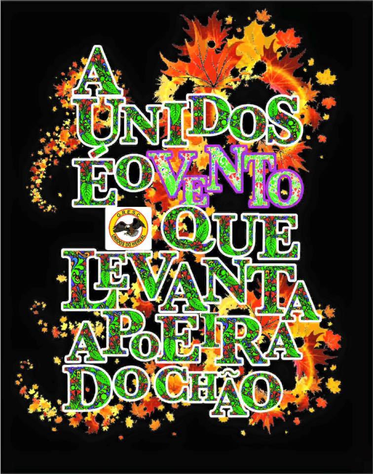 Em doce vento suave, embalante, aconchegante, Zéfiro levou Psiquê adormecida, apaixonada por Eros, o Deus do Amor, a ele entregue, subjugada. Em requintado palácio dourado, pelo vento foi deixada, a Menina-Borboleta, uma tão suave flor. Zéfiro foi condutor da união que se formou da Alma com o Amor, o mais sublime elemento, o mais puro sentimento que a natureza criou. O vento ventou na história e gravou na memória momentos e descobrimentos que a humanidade viveu. Impulsionou caravelas, inflou velas no mar, empurrou naus perdidas daqui pra ali, de lá pra cá. O vento virou elemento, virou rocha, virou monumento, virou rosa, virou vento, virou rosa dos ventos, apontando caminhos e direções, acompanhando constelações, empurrando navios pelos mares sem fim, levando a novas paragens, novos mundos enfim. E o nobre cavaleiro andante por natureza, sem teto ou paradeiro, da triste figura conhecido, combatente combalido, defendendo a “beleza” da senhora Dulcinéia, de duvidosa nobreza. Contra moinhos de vento, gigantes indomados, arremeteu seu corcel Rocinante, tão magro e despelado. Dom Quixote foi pelo vento vencido, e em delírios imaginava gigantes ter combatido. Frestão, o mago ladino, mais uma vez sorrateiro, ludibriou a já confusa mente de tão nobre cavaleiro. Vento que balança o bambuzal, vento que canta que assobia, que ajunta, que espalha, brincando a revelia. Ventando de um lado pro outro, em permanente bailar, é Oyá, é Iansã, senhora do relampiar. Chega fazendo arruaça, jogando tudo no ar; no ar que é vento, o movimento de seu divino dançar, virando de ponta a cabeça ou de cabeça à ponta, gemendo, sussurrando, gritando, ventando ela desponta. De lado, quase meio sem querer, de dentro do bambuzal pulou o Saci Pererê, esperto menino negrinho, com cachimbo e carapuça, surgiu num redemoinho, já de sorriso na fuça, peralta e matreiro, exigindo dos viajantes fogo pro seu candeeiro. Do pulo do Saci para as telas do cinema, uma poesia, um poema o vento também deixou... Cadê a mocinha Scarlett de “E O Vento Levou”? Sobre desolada Tara, a valente heroína chorou. E nas terras tupiniquins, uma grande produção – O Tempo E O Vento –, a saga do povo gaúcho em formação. O tempo marcado pelo vento que venta pelos pampas do sul, contou a trajetória de lutas e de glórias do Capitão Rodrigo, em campos verdes e céu azul. Venta no cata-vento, amarelo, vermelho, branco ou anil, lúdica brincadeira, tão doce, tão infantil. Empina a pipa, solta o balão, tem criança descalça, brincando com o pé no chão. Correndo de um lado pro outro, cabelos em desalinho, fazendo surgir do nada bagunçado redemoinho. Entre risos e gargalhadas, ´arteando´ solto ao léu, pula gritando feliz...”Viva, viva, ventou, a pipa já ‘tá’ no céu!” E no alto da montanha, no campo, na pradaria, usando a força do vento, em constante movimento vejo o grande cata-vento, produzindo energia. Puro e não poluente, agrada a Mãe Natureza, Senhora do Meio Ambiente, que sorri agradecida, e presenteia a avenida com majestoso desfile, transformada em águia guerreira, da Unidos sempre altaneira, sambista, brincante, cantando esfuziante, com garra e emoção: “A UNIDOS É O VENTO QUE LEVANTA A POEIRA DO CHÃO!”