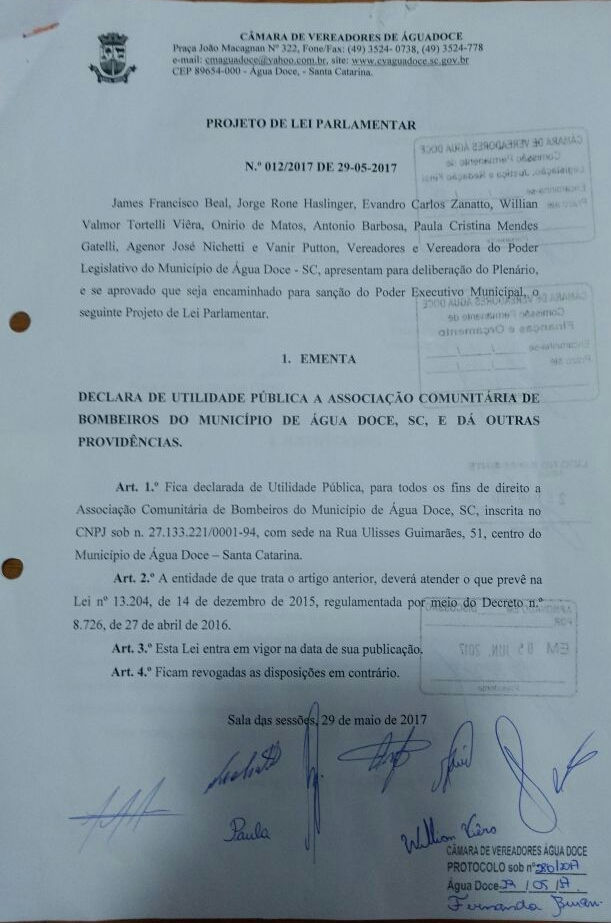 Projeto de Lei 012/2017 e Lei 2.512/2017 foram aprovados pela Câmara de Vereadores. Corpo de Bombeiros Militar já atua no município há anos, antes mesmo da criação da Associação Comunitária de Bombeiros de Água Doce.