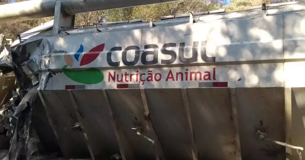 O impacto fez com que a cabine do caminhão de ração ficasse destruída. O motorista da carreta teve apenas um ferimento na região do olho.