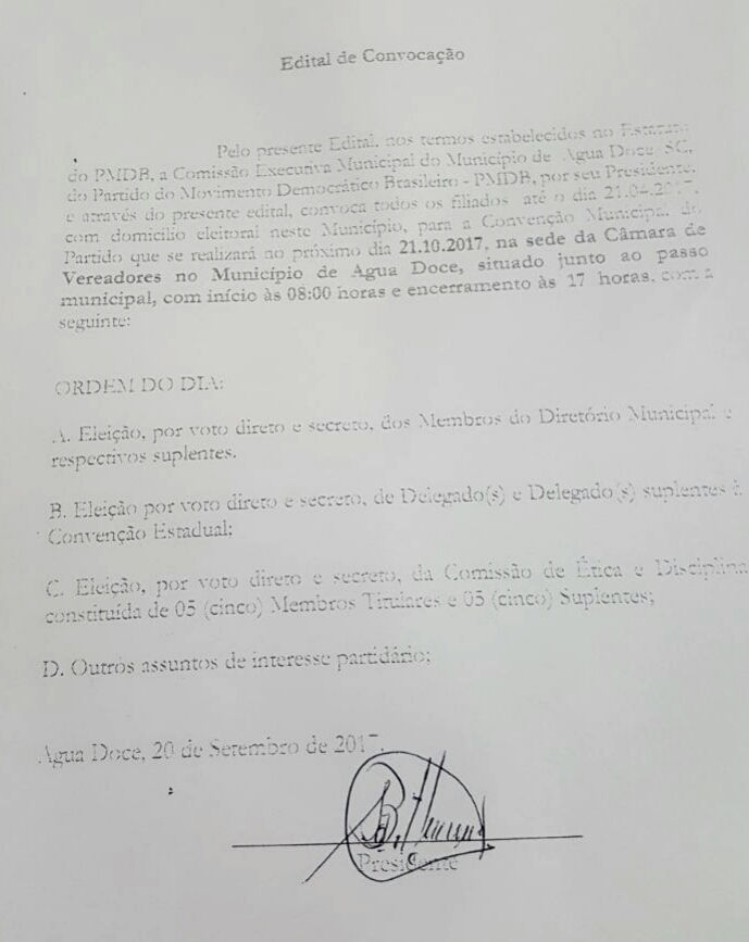A eleição da nova diretoria do PMDB de Água Doce será realizada no dia 21 de outubro, das 08h as 17h, na sede da Câmara de Vereadores. O partido visa se fortalecer para as Eleições 2018, que será uma espécie de prévia para 2020.