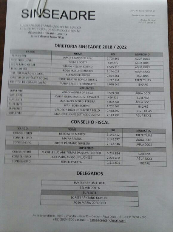 O Sindicato dos Servidores Municipais de Água Doce e Região (Sinseadre), realizou nesta quinta-feira (19), sua eleição de diretoria e conselho fiscal. A organização atende 220 servidores associados, dos municípios de Água Doce, Ibicaré, Luzerna e Treze Tilias.