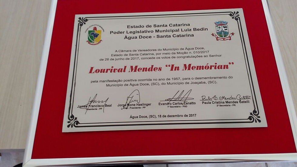 E por fim, os vereadores homenageiam o Senhor Lourival Mendes e o Doutor Alvino Raittz, ambos “In Memórian,” pela manifestação positiva ocorrida ainda no ano de 1957, para o desmembramento do Município de Água Doce, do Município de Joaçaba.