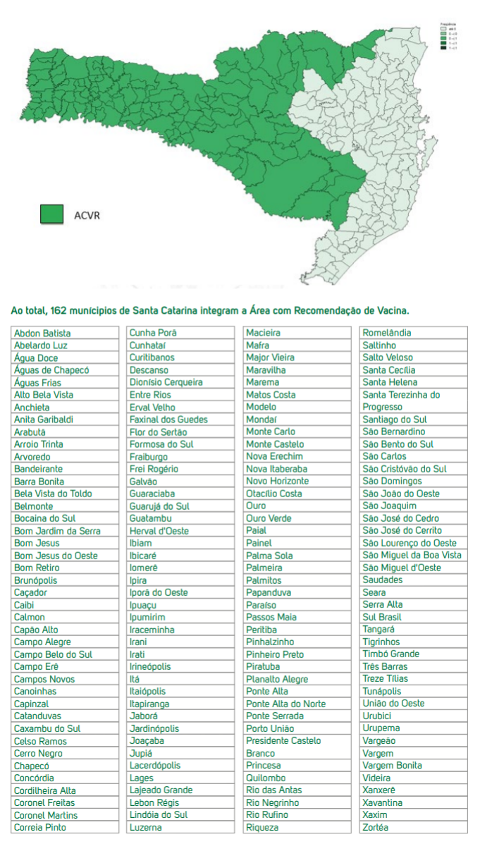 Moradores de Água Doce e outros 161 municípios catarinenses estão em área recomendada para vacinação. As vacinas estão sendo aplicadas na Secretaria Municipal da Saúde, na Rua Frei Dário, anexo ao Hospital Nossa Senhora da Paz. Dos casos suspeitos em SC, dois evoluíram para óbito, um residente em Gaspar e o outro morador de Lajeado Grande. Na tarde desta terça-feira (23), o caso da mulher de 57 anos que veio a óbito em Gaspar foi confirmado. Outros cinco são residentes nos municípios de Joinville (1), São José (1), Lages (1), Criciúma (1) e Timbó (1). Os exames laboratoriais estão sendo realizados pela Fundação Oswaldo Cruz (Fiocruz) do Paraná, laboratório de referência em febre amarela para Santa Catarina, e os resultados podem levar até 20 dias para serem liberados. De 1º a 22 de janeiro deste ano, oito epizootias - ocorrência de um determinado evento em um número de animais ao mesmo tempo e na mesma região - foram registradas em Santa Catarina, com oito primatas não humanos (macacos) envolvidos (ainda em investigação). De acordo com a Gerência de Zoonoses da Dive/SC, houve coleta oportuna de amostras em quatro deles, cujos resultados estão sendo aguardados. Sintomas A febre amarela é uma doença viral que causa dores no corpo, mal-estar, náuseas, vômitos e, principalmente, febre. Os sintomas duram em média três dias. Em alguns pacientes, o vírus da febre amarela ataca o fígado. São as complicações hepáticas que levam as pessoas infectadas a ficar com uma cor amarelada, daí o nome febre amarela. Segundo o Ministério da Saúde, estima-se que em torno de 30% das pessoas que contraem a doença podem morrer, se não forem diagnosticadas precocemente. Por isso, a recomendação é a de que o paciente deve buscar imediatamente atendimento adequado nas unidades de saúde.