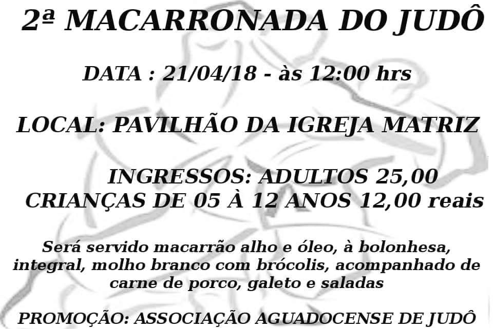 A Associação Águadocense de Judô promove neste sábado (21), uma macarronada beneficente. O almoço será servido, a partir das 12h no Salão Paroquial da Igreja Matriz. O ingresso custará R$ 25 para adultos e R$ 12 para crianças de 05 a 12 anos.