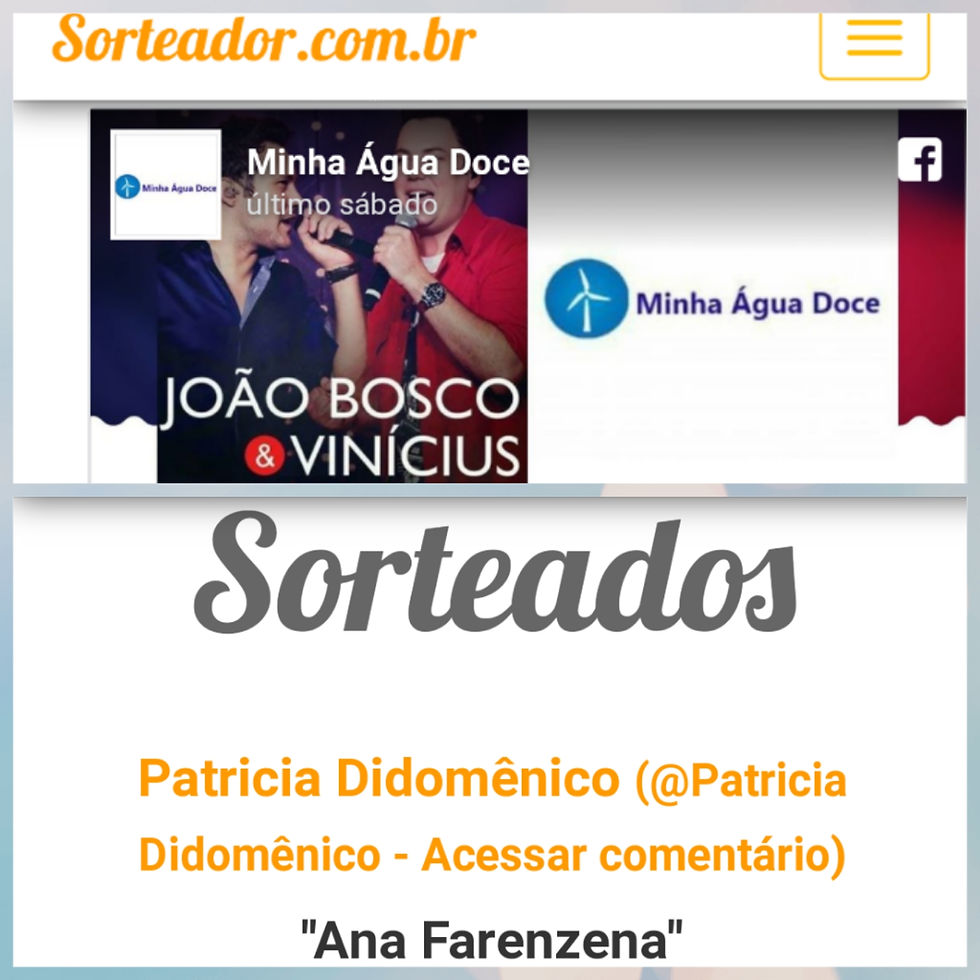 Quem levou o par de ingressos para o show nacional de João Bosco & Vinícius no aniversário de 60 anos de Água Doce foi a leitora Patricia Didomênico (@Patricia Didomênico) que vai curtir o evento com "Ana Farenzena".